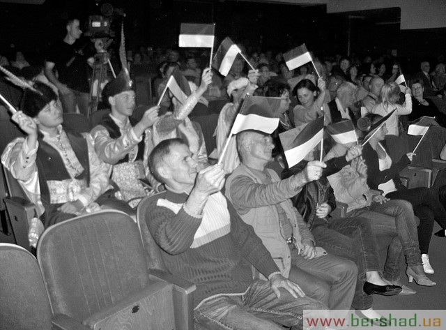 При поверненні, вже тепер з нашими самодіяльними артистами, в основному з Вінницького аграрного університету, які також подорожували до Берна автобусом, ми зупинилися в польському місті Кельце, яке є центром Свентокшинського воєводства, з яким Вінниччина співпрацює вже 50 років. В центральному палаці культури цього міста вінничанами було дано концерт, який пройшов з великим успіхом під схвальні вигуки польських глядачів з українськими прапорцями (на знімку). Відкрив його заступник мера, який після цього влаштував усім вінничанам святкову вечерю.