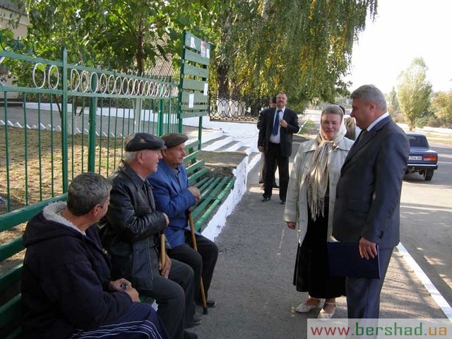 На знімку: голова райдержадміністрації О.Ф. Снігур (справа наліво) та сільський голова М.В. Замкова спілкуються з пенсіонерами Ф.К. Ратушняком, Г.М. Клебанським та Д.С. Козійчуком.