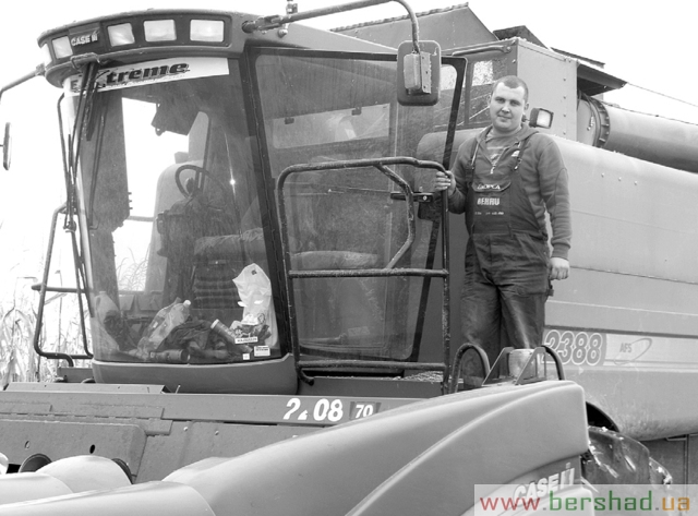 У день, коли ми заїхали на кукурудзяне поле, воно виявилося останнім у цьому сезоні, на якому комбайнери підприємства Володимир Васильович Бондарчук (на знімку) та Ігор Васильович Шевчук закінчували обмолот качанистої. Приємно було бачити з якою швидкістю їхні «Кейси» прямо таки «літали» в загінках. Адже хіба міг хтось ще донедавна уявити, що одним таким комбайном навіть таку культуру, як кукурудза, можна буде молотити щодня на площі до тридцяти гектарів.