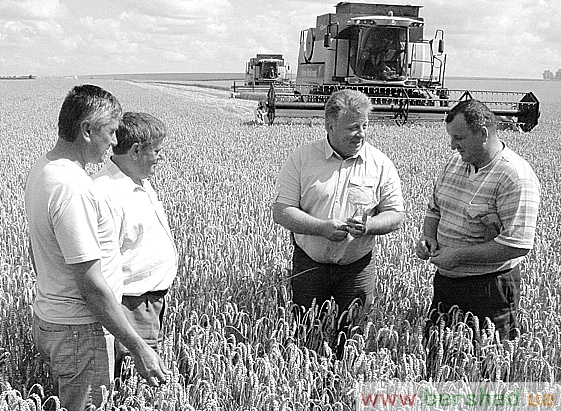Директор Бершадської філії ПрАТ «Зернопродукт МХП» Сергій Рудченко (другий справа) з керівниками і спеціалістами на жнивному полі.