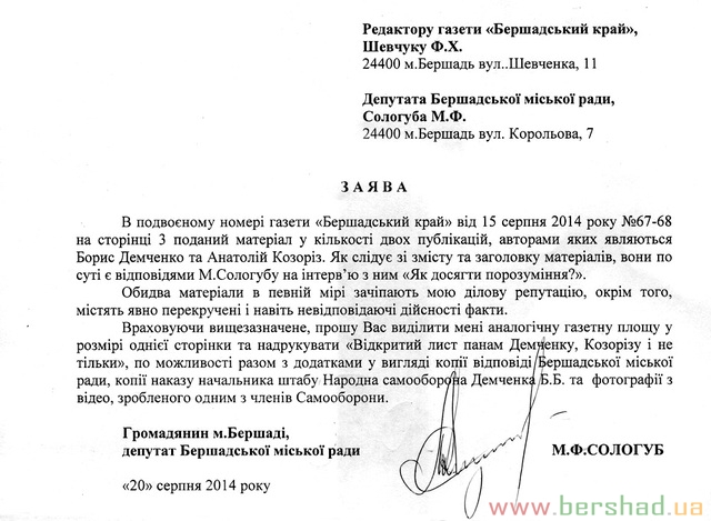 Щиро дякую за пропозицію. Але вона значно запізнилась. Задовго до цієї пропозиції та без Вашого нагадування я, так само, як і тисячі інших патріотично налаштованих громадян України, надавав та продовжую надавати посильну матеріальну допомогу, включаючи і допомогу продуктами, як для бійців АТО, так і для біженців з окупованого Криму та закривавленого Сходу країни. До речі, пане Борисе, і перший бершадський майдан на підтримку побитих у Києві студентів, 1 грудня 2013 року о 12 годині дня, був скликаний і організований в Бершаді з ініціативи двох сімей, однією з яких була моя. І нехай тоді на майдан прийшло всього 15-17 чоловік, але в ті неспокійні часи, вони, на відміну від Вас, були без бронежилетів, в той час, як майже вся Ваша команда 13 липня 2014 року з’явилась на віче на площу міста Бершаді в бронежилетах. Для чого Ви їх наділи – для захисту від містян?