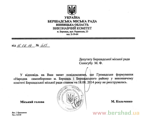 Згідно із відповіддю, наданою мені Бершадською міською радою (вих..№413 від 18.08.2014р.): «Громадське формування «Народна самооборона» міста Бершаді і Бершадського району у виконавчому комітеті Бершадської міської ради станом на 18.08.2014 року не реєструвалась». Не реєструвались у виконкомі Бершадської міської ради до цього часу і будь-які інші громадські формування з охорони громадського порядку, в тому числі і міжрайонні.