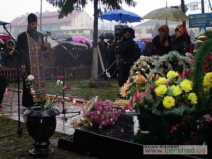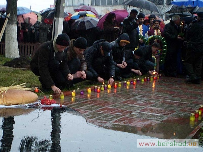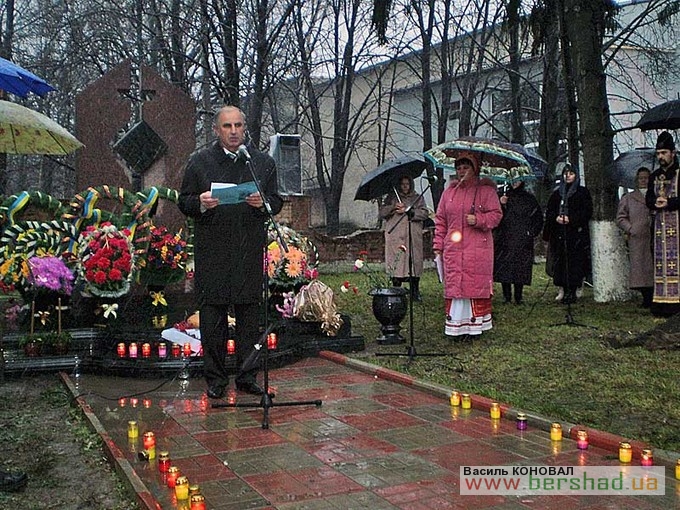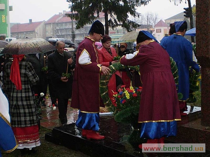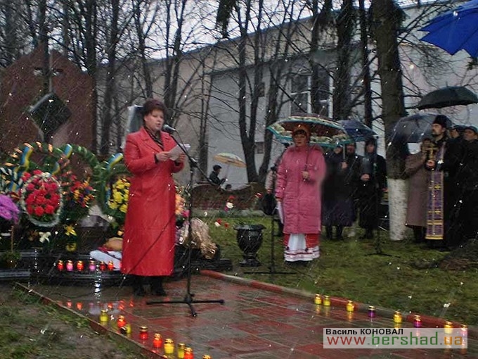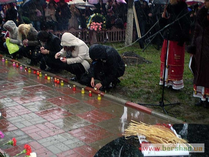 З нагоди 75-х роковин голодомору 1932-1933 років та відкриття оновленого пам’ятника його жертвам минулої суботи в Бершаді відбувся мітинг-реквієм за участю керівників району та міста, представників трудових колективів, політичних партій та громадських організацій. Учасники мітингу запалили свічки пам’яті, вогонь яких наповнив серця смутком на згадку про жертви трагедії. Вінки та квіти до пам’ятника жертвам голодомору поклали голова райдержадміністрації С.Л. Шульц, голова районної ради М.Г. Бурлака, міський голова М.І. Кольченко, представники громадськості. Молитву за померлими з голоду провів настоятель Свято-Вознесенського храму протоієрей Олег Мураховський. Про найстрашніший злочин людства, що забрав життя у мільйонів ні в чому не повинних людей, якому не може бути історичного забуття і прощення, говорили у своїх виступах голова райдержадміністрації С.Л. Шульц, голова районної ради М.Г. Бурлака і свідок голодомору Т.А. Візнюк. Голодна катастрофа, підкреслювали виступаючі – найсмертельніший удар тоталітарного режиму. Лихоліття минулих років ні в якому разі не повинно більше повторитися. Життя кожної людини – безцінний скарб, тож і пам’ять про кожну людину повинна зберігатися й передаватися нащадкам. Керівники району та міста висадили кущі калини біля пам’ятника жертвам голодомору. Цього ж дня бершадці взяли участь і в загальнонаціональній акції “Запали свічку” – жителі міста і сіл району о 16-ій годині запалили свічки біля ікон, на підвіконнях у себе вдома, в установах, вшановуючи пам’ять загиблих… Минають роки, десятиліття, та зболена пам’ять про заморених голодом має жити вічно. Як нагадування про минуле і пересторога майбутньому. Цього ж дня представники Бершадщини брали участь в заходах з нагоди 75-х роковин голодомору 1932-1933 років у області, а делегація, очолювана заступником голови РДА О.Д. Кравчуком, – у м. Києві. Василь ВЕРБЕЦЬКИЙ.
