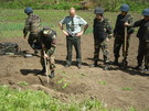 Було завезено 300 мішків відсіву, стільки ж глини, до того ж, місце вкрили ще й піском та глиною. Загалом «сорочка», в яку одягнули бомбу, важила 70 тонн Жителька села Марія Новак того дня садила у себе на городі кукурудзу. Як раптом сапа наткнулась на щось металеве. Думала витягнути ту залізяку, але вона виявилася занадто великою. Зрозуміла, що ця велика річ може бути небезпечною. Тому, облишивши роботу, поспішила повідомити про це сільського голову. Коли Микола Сінолуп прибув на місце, він зрозумів, що знахідка справді дуже небезпечна. Тож огородив її спочатку гіллям, зателефонував у відповідні служби. Жителів села повідомили про небезпеку. Довелось організувати цілодобове чергування. Керівник села теж брав у ньому участь. Наступний день був напруженим для багатьох десятків людей – працівників служби цивільного захисту, міліції, військкомату і, звичайно ж, жителів села. Жодної вільної хвилини не мав начальник відділу з надзвичайних ситуацій райдержадміністрації Борис Обуховський. Адже небезпечну знахідку потрібно було не тільки знешкодити, а й зробити це, не завдавши шкоди людям, зберегти життя і здоров’я кожного. Коли на місце прибула піротехнічна група головного управління МНС у Вінницькій області на чолі з полковником служби цивільного захисту Анатолієм Жуковим, і фахівці проаналізували ситуацію, стало зрозуміло, що бомбу часів Великої Вітчизняної війни ФАБ-500 вагою півтонни ні в якому разі не можна зрушувати з місця, бо вона може вибухнути в будьяку мить. Вирішено було підривати її на місці. Для цього потрібно було евакуювати жителів будинків на безпечну відстань. А поки проводилася ця робота, фахівці виконували свою. Керівництво ТОВ «Устянське» виділило потрібну техніку для завезення відсіву, піску та глини. Було завезено 300 мішків відсіву, стільки ж глини, до того ж, місце вкрили ще й піском та глиною. Загалом «сорочка», в яку одягнули бомбу, важила 70 тонн. А зробили це для того, щоб максимально приглушити вибух. Допомогли технікою і з комунгоспу. Енергетики на кілька годин познімали дроти з відрізків ліній електропередач, які проходять поблизу – всього по десять прольотів. Це було зроблено для того, щоб можливі осколки не зачепили дротів і не спрацював принцип доміно, через що могло попадати багато опор. Працівники Державтоінспекції на одну годину перекрили рух транспорту, адже садиба Марії Савівни з городом прямо біля автотраси. Організовано провели евакуацію населення – близько 800 чоловік, по кілька разів перевірили, чи всі залишили свої домівки. Загалом обійшли 174 хати. По вулицях села проїхав автомобіль з гучномовцем, через який попередили про необхідність відійти всім до безпечної зони. Лише тоді, коли всіх заходів безпеки було дотримано, травневу сільську тишу розірвав потужний вибух… Ніхто з людей не постраждав, зазнали пошкоджень лише дахи над ближніми будинками та шибки (розмір шкоди зараз уточнюється – усім цим господарям буде виплачена відповідна компенсація). Та ще, кажуть, в одного з жителів села загинув старий пес… Осколки розлетілися в радіусі до чотирьохсот метрів. А в епіцентрі вибуху утворилася кількаметрова вирва. Земля спресувалася в грудки тверді, ніби каміння. Господарці садиби допоможуть вивезти ці брили і завезти нормальний чорнозем, впорядкувати город, пошкоджений вибухом. Як сказав полк